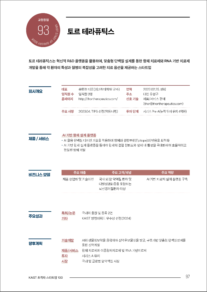 (주)토르 테라퓨틱스, 2025 KAIST Startup Directory Book(KSDB) 등재